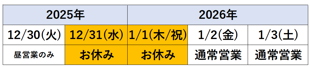 【休業日】2025年12月31日(水)~2026年1月1日(木/祝)